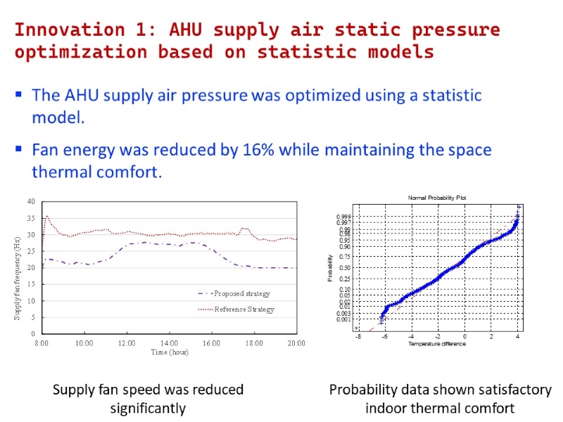 - HVAC Air Side System: replaced the conventional supply air static pressure set-point reset logic with an innovative optimization strategy based on statistic models. The new fault tolerant control strategy could deal with faults in VAV terminals or improper temperature settings in air-conditioned spaces.