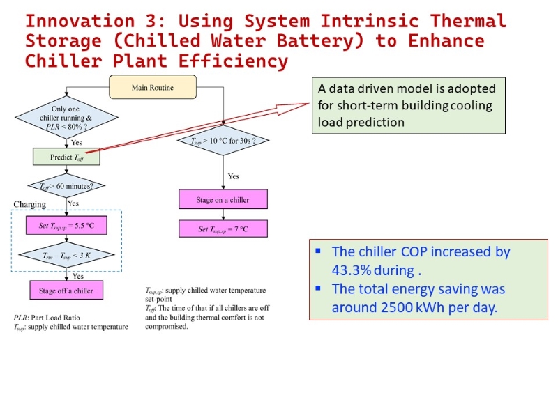 - HVAC Chilled Water System: Developed a new control strategy to utilize system intrinsic thermal storage (Chilled Water Battery) to enhance chiller plant efficiency. By utilizing the chilled water delivery network as a thermal storage system, the chiller plant efficiency could be significantly improved during low load conditions.