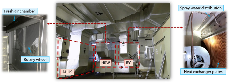 Two Regenerative Indirect Evaporative Coolers (RIEC) are designed and installed in parallel with the two existing heat recovery wheel (HRW) systems. The cool exhaust air from the indoor environment is introduced to the IEC secondary air channels. The fresh air is pre-cooled before it passes through the AHUs.