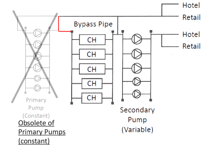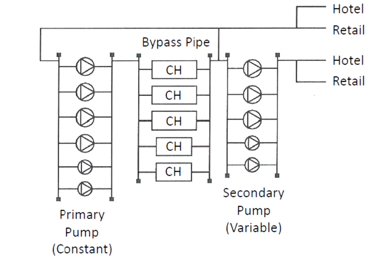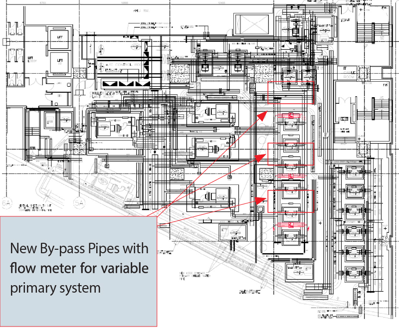Modified chilled water system from existing constant primary and variable secondary to variable primary system. Use of existing primary chilled water pump sets were suspended and new bypassing primary loop system completed in early Feb 2021. The related performances are continuously monitored by the Cloud-Based Smart Energy Management Platform (CBSEMP).